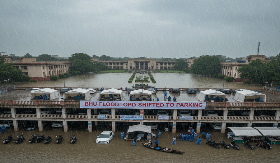 वाराणसी में बीएचयू क्षेत्र में हुई बारिश ने अक्टूबर महीने का 125 साल पुराना रिकॉर्ड तोड़ दिया। शुक्रवार सुबह 8:30 बजे से भोर 5:30 बजे तक यहां 187 मिमी वर्षा दर्ज की गई, जिससे पूरे इलाके में जनजीवन अस्त-व्यस्त हो गया। बीएचयू अस्पताल और ट्रॉमा सेंटर परिसर में कमर तक पानी भर गया, जिससे मरीज और उनके परिजनों को भारी परेशानी झेलनी पड़ी। कई चिकित्सक अपने कक्ष तक नहीं पहुंच पाए और मजबूरन पार्किंग में ही ओपीडी लगाकर मरीजों का इलाज करना पड़ा। बाल रोग विशेषज्ञ डॉ. सुनील कुमार राव और डॉ. अनिल कुमार सरोज ने पार्किंग में खड़े होकर मरीजों की जांच की। वहीं, अस्पताल परिसर में खड़ी कई दोपहिया और चारपहिया गाड़ियां पानी में डूब गईं।