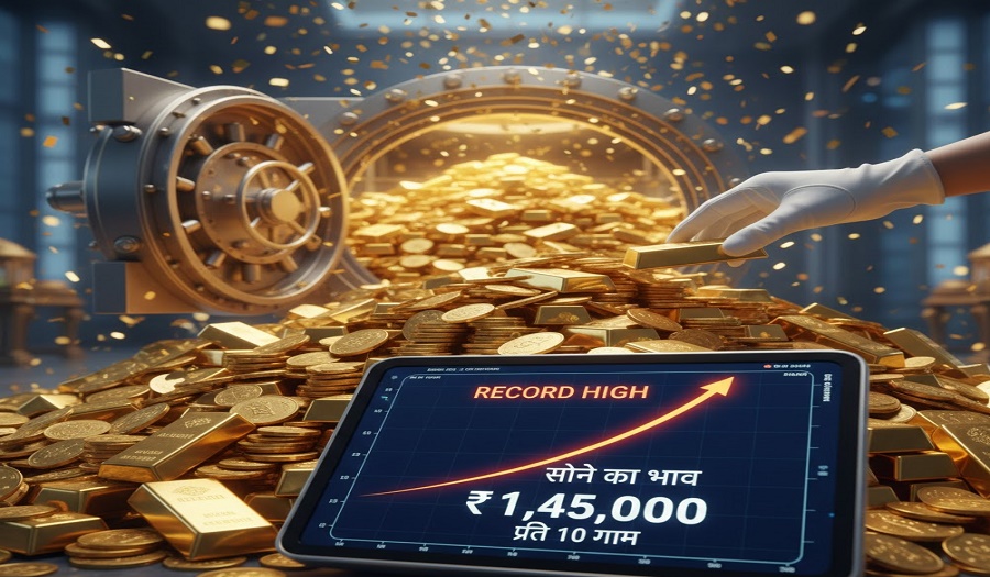 सोमवार के ट्रेडिंग सत्र में एमसीएक्स पर फरवरी डिलीवरी वाला सोना 1,45,500 रुपये प्रति 10 ग्राम के रिकॉर्ड स्तर तक पहुंच गया। एमसीएक्स गोल्ड फरवरी वायदा 2,438 रुपये यानी 1.71 प्रतिशत की तेजी के साथ 1,44,955 रुपये प्रति 10 ग्राम पर कारोबार करता दिखा। अंतरराष्ट्रीय बाजार में भी सोने की कीमतों में जबरदस्त उछाल दर्ज किया गया। स्पॉट गोल्ड 1.6 प्रतिशत से अधिक बढ़कर 4,700 डॉलर प्रति औंस तक पहुंचा और बाद में 4,670 डॉलर के आसपास स्थिर हो गया। इस दौरान सोने ने अब तक का सबसे ऊंचा स्तर छुआ।